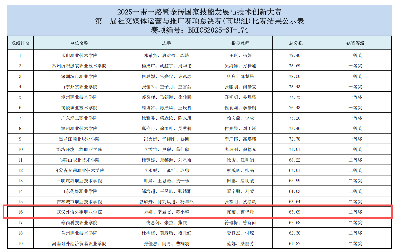 11月26日,2025“一带一路”暨金砖国家技能发展与技术创新大赛第二届社交媒体运营与推广赛项总决赛圆满收官。我校财经与商贸学院李君文、方妍、苏小整三位学子组成的团队,从全国近百支参赛队伍中脱颖而出,凭借出色的创意策划与实操能力,斩获全国二等奖,实现了学校在该赛项的历史性突破,彰显了我校传媒类人才培养的实践实力与创新活力。