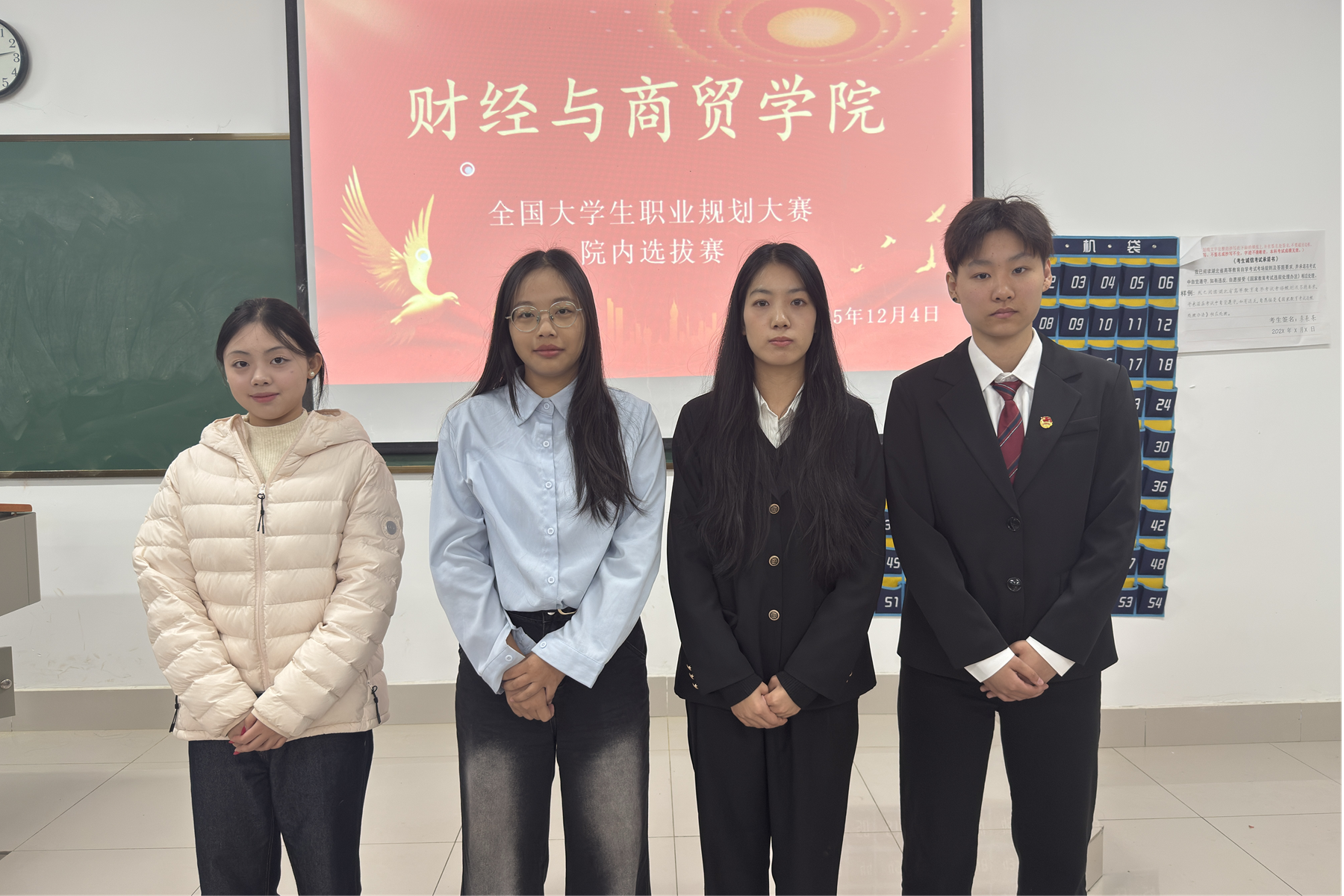 2025 年 12 月 4 日,财经与商贸学院大学生职业规划大赛院级决赛顺利收官。本次大赛以 “规划职业生涯,点亮职业理想” 为主题,精准聚焦学院学子职业发展核心诉求,深度覆盖现代物流、大数据与会计、金融科技应用、跨境电子商务、电子商务、融媒体技术与运营、国际经济与贸易七大专业领域。经多轮比拼,17 名选手脱颖而出晋级院级决赛,最终 4 名选手凭借逻辑清晰的规划方案与出色的现场表现斩获晋级资格,将代表学院征战校级大学生职业规划大赛。
