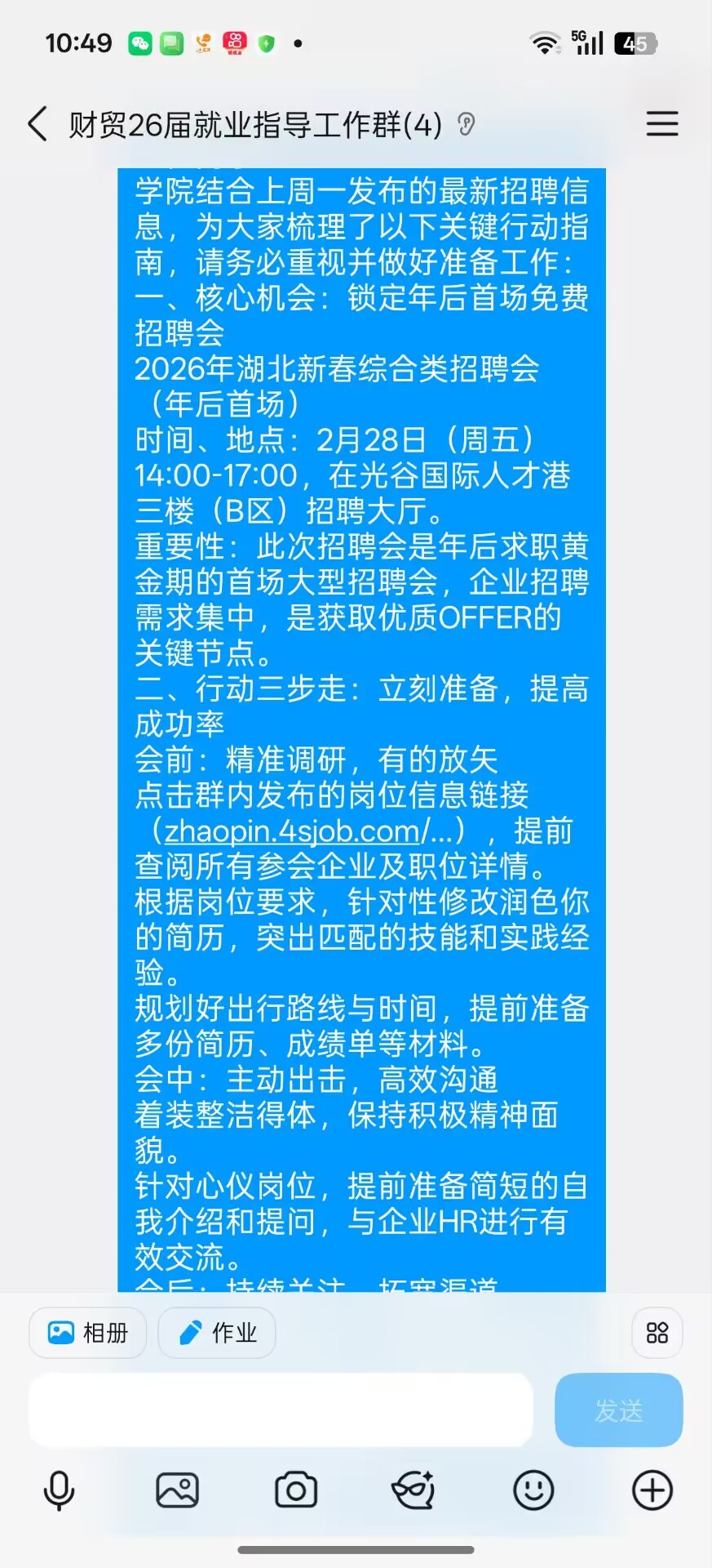 本次专项指导聚焦2026 年湖北新春综合类招聘会(年后首场),明确了核心行动方向。该招聘会将于 2 月 28 日(周五)14:00-17:00 在光谷国际人才港三楼(B 区)招聘大厅举办,作为年后求职黄金期的首场大型招聘会,企业招聘需求集中,是毕业生获取优质 OFFER 的关键节点。学院通过线上工作群,第一时间将招聘会时间、地点及重要性传递给每一位未就业学生,引导大家高度重视、提前布局。