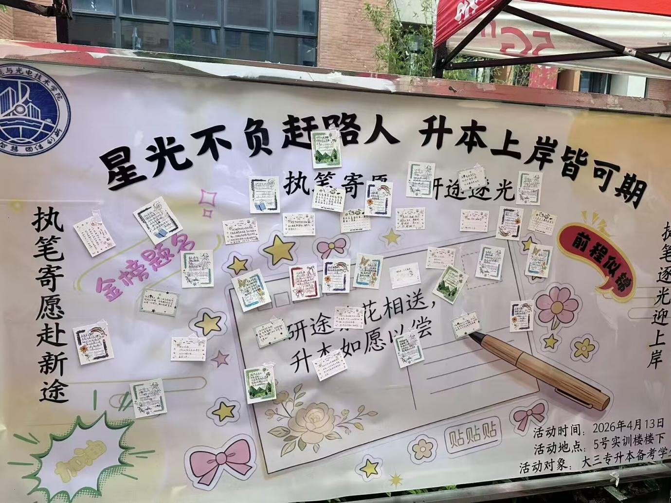 活动以“星光不负赶路人,升本上岸皆可期”为核心主题,旨在以有温度的形式陪伴备考学子走过关键阶段。活动现场,学院精心布置了主题祝福展板,展板上“执笔寄愿赴新途”“执笔逐光迎上岸”等励志标语与“金榜题名”“前程似锦”的装饰元素相互映衬,成为校园里一道温暖的风景线。展板核心的“贴贴贴”留言区早已被同学们手写的明信片填满,每一张卡片都承载着备考学子的自我期许与相互鼓励,一笔一划间,皆是奔赴理想的坚定决心。