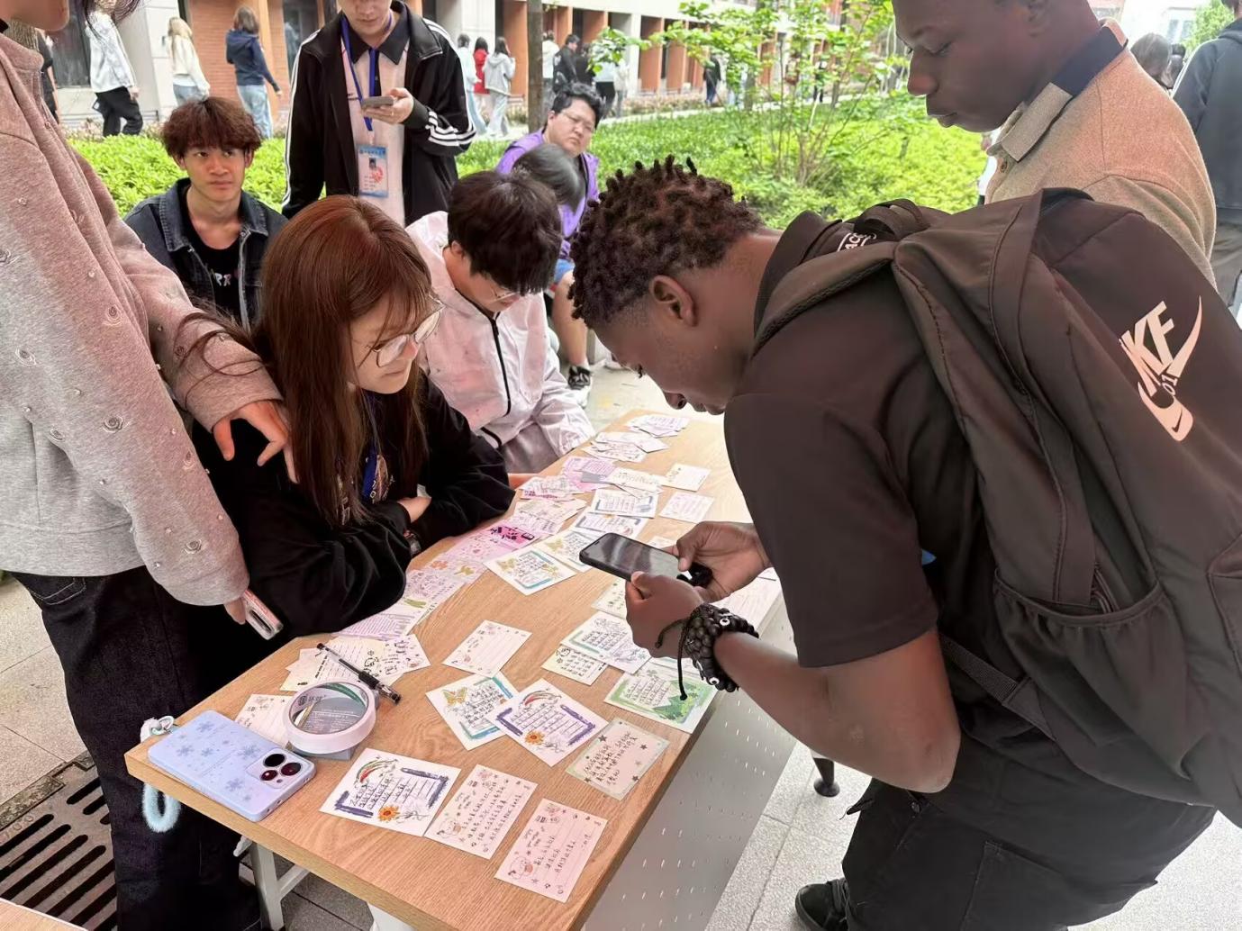 为让学子们充分表达心声,学院在展板旁设置了明信片书写桌,整齐摆放着空白明信片、书写笔等物料。同学们围坐桌前,或认真写下对自己的冲刺寄语,或为身边备考的伙伴送上暖心祝福,现场氛围温馨而热烈。值得一提的是,活动不仅吸引了本院学子积极参与,更有来自不同文化背景的同学驻足参与,用独特的方式为专升本学子送上祝福,让这场暖心活动更添多元色彩。