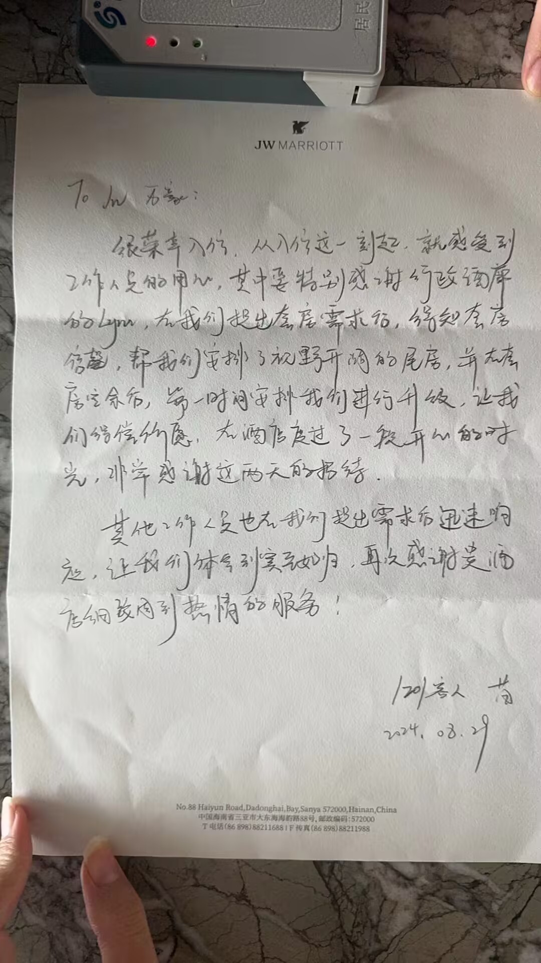 “JW是万豪集团奢华品牌,通过彰显品牌对款待员工所付出的热诚与专注,进而为客人提供更宾至如归的非凡服务。在实习过程中我掌握了行政酒廊的工作流程和岗位职责,虽工作中碰到很多困难,但是也碰上许多感人、美妙的故事,在酒店实习,我认识到无论到哪个部门,都要燃起前进的勇气,坚持下去,不断学习、积累,以高度的责任感去工作,困难挫折总是可以迎刃而解。”林思颖分享到,她也是这样做的,所以她在很短的时间内,就获得了客人的手写表扬信,成就感+1。