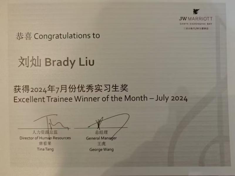 (通讯员 谷芸子)22级酒管学生刘灿荣获万豪酒店集团旗下奢华品牌酒店---三亚山海天JW万豪酒店颁发的优秀实习生的荣誉。
