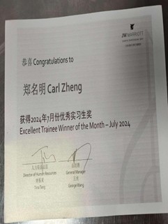 (通讯员 谷芸子)22级酒管学生郑名明在三亚山海天JW万豪酒店西餐厅因非凡服务取得了优秀实习生的荣誉。