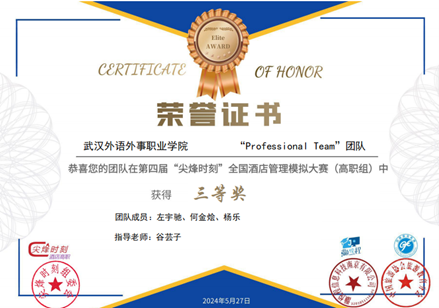 (通讯员 谷芸子)23级酒管学子左宇驰、何金烩、杨乐荣获第四届尖烽时刻全国酒店管理模拟大赛(高职组)全国三等奖。该赛项由中国旅游协会旅游教育分会、灏悦程信息科技南京有限公司、尖烽时刻组委会联合主办第四届尖烽时刻全国酒店管理模拟大赛(高职组)。