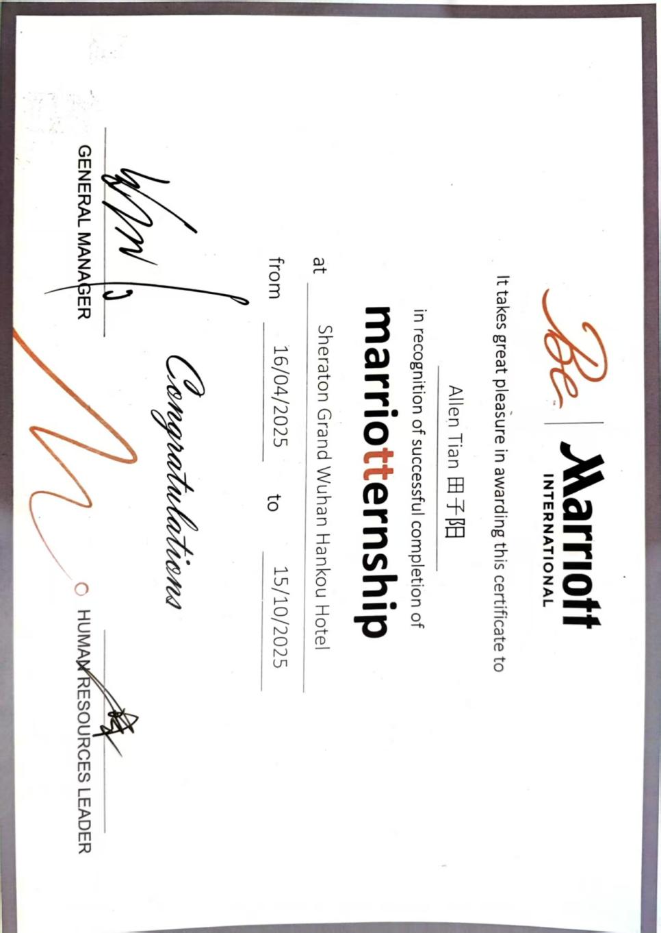 从初入岗位的谨慎探索到独当一面的从容自信,田子阳同学在武汉汉口喜来登大酒店的实习经历中,不仅将课堂所学的酒店管理知识转化为实际操作能力,更在服务他人的过程中锤炼了责任意识与职业素养。他用实际行动诠释了“学以致用、知行合一”的理念,展现了当代青年学子勤奋踏实、积极向上的良好风貌。