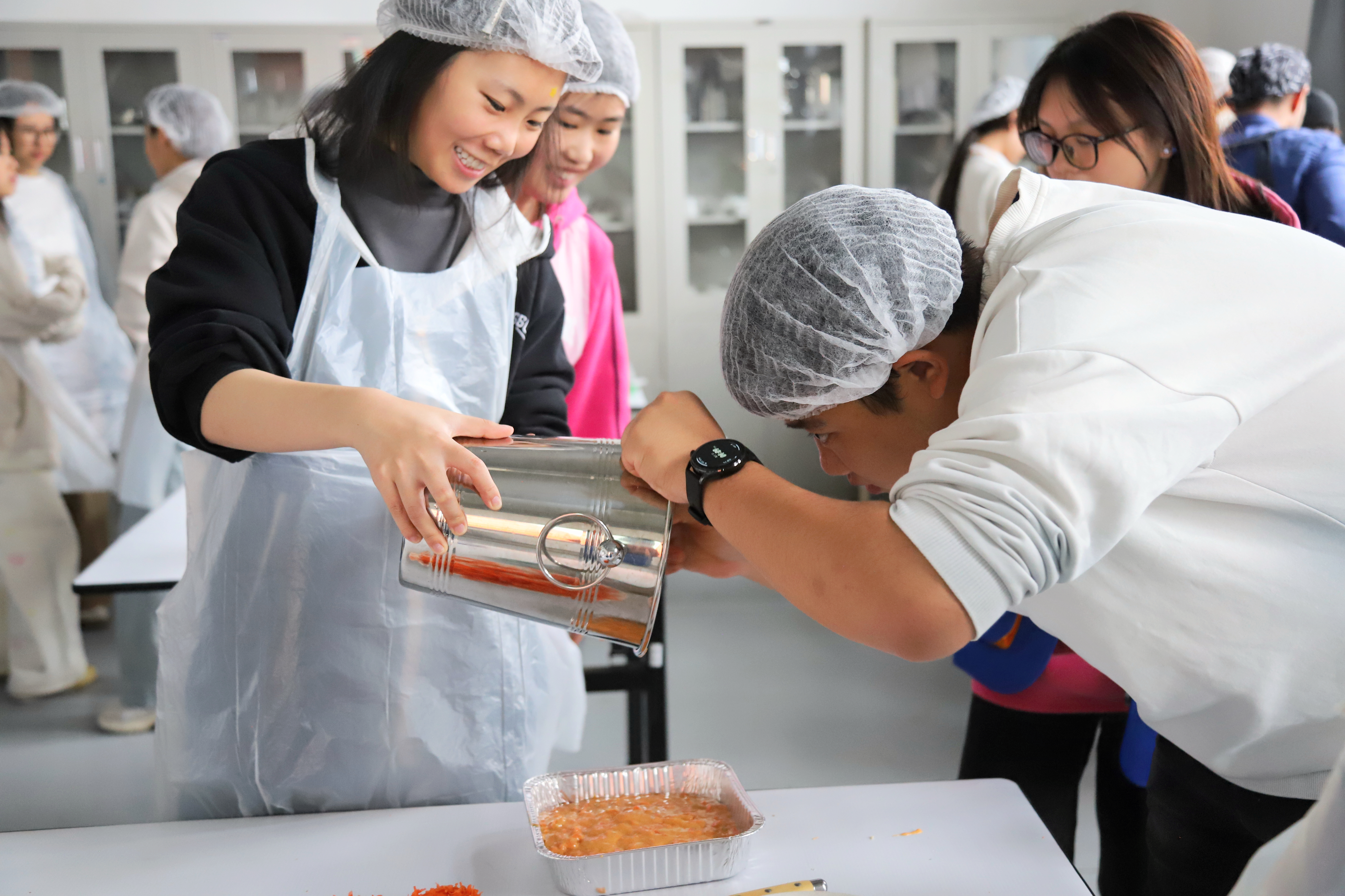 活动开始,Ruben老师通过西班牙语教学视频展示了胡萝卜蛋糕的传统制作流程。为促进学生的交流协作,活动采用混合分组模式。每组均合理搭配有烹饪经验的学生。实操过程中,Ruben老师穿梭于各个小组,用西班牙语实时指导制作过程。从胡萝卜切丝、核桃碾碎、到蛋液打发状态与配料配比,每个步骤都成为专业词汇与语法结构的实践场景。这种教学模式使专业术语记忆与实操过程形成深度绑定,让学生在实践操作中自然习得专业词汇与句型。