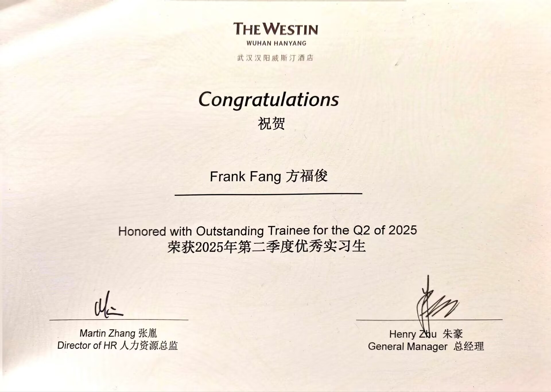 新闻网讯(通讯员 张丽娜)我校2023级智能机电技术专业1班方福俊同学在武汉汉阳威斯汀酒店的专业实习中表现突出,被酒店授予“2025年第二季度优秀实习生”的荣誉称号。这一荣誉不仅是对他个人专业能力与职业素养的高度认可,也是我校深化产教融合、培养高素质技术技能人才的生动体现。