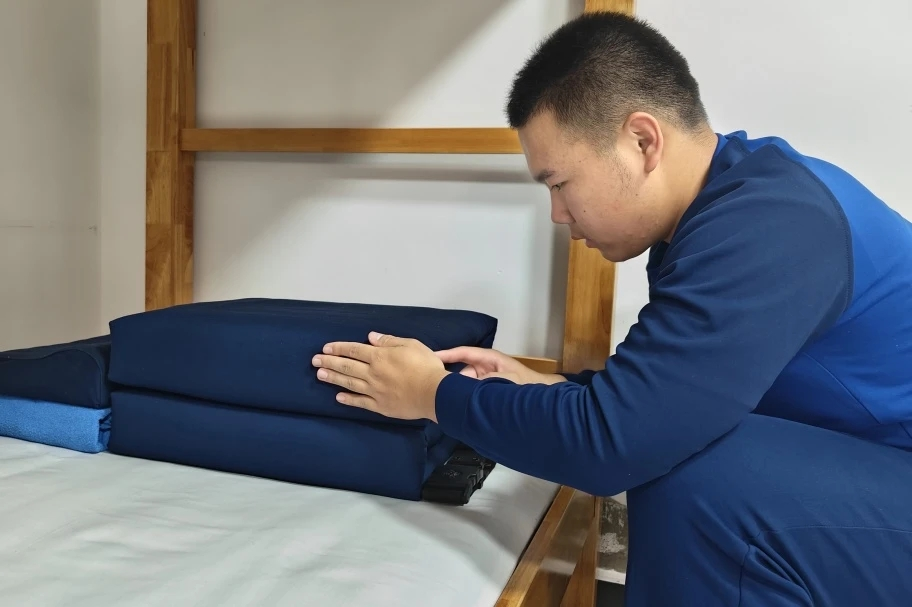 宿舍内,新消防员开始整理内务,他认真学习“三分理七分修”的要领,一丝不苟地整理床铺、规整物品,在方寸之间体悟消防队伍严谨细致、精益求精的作风。