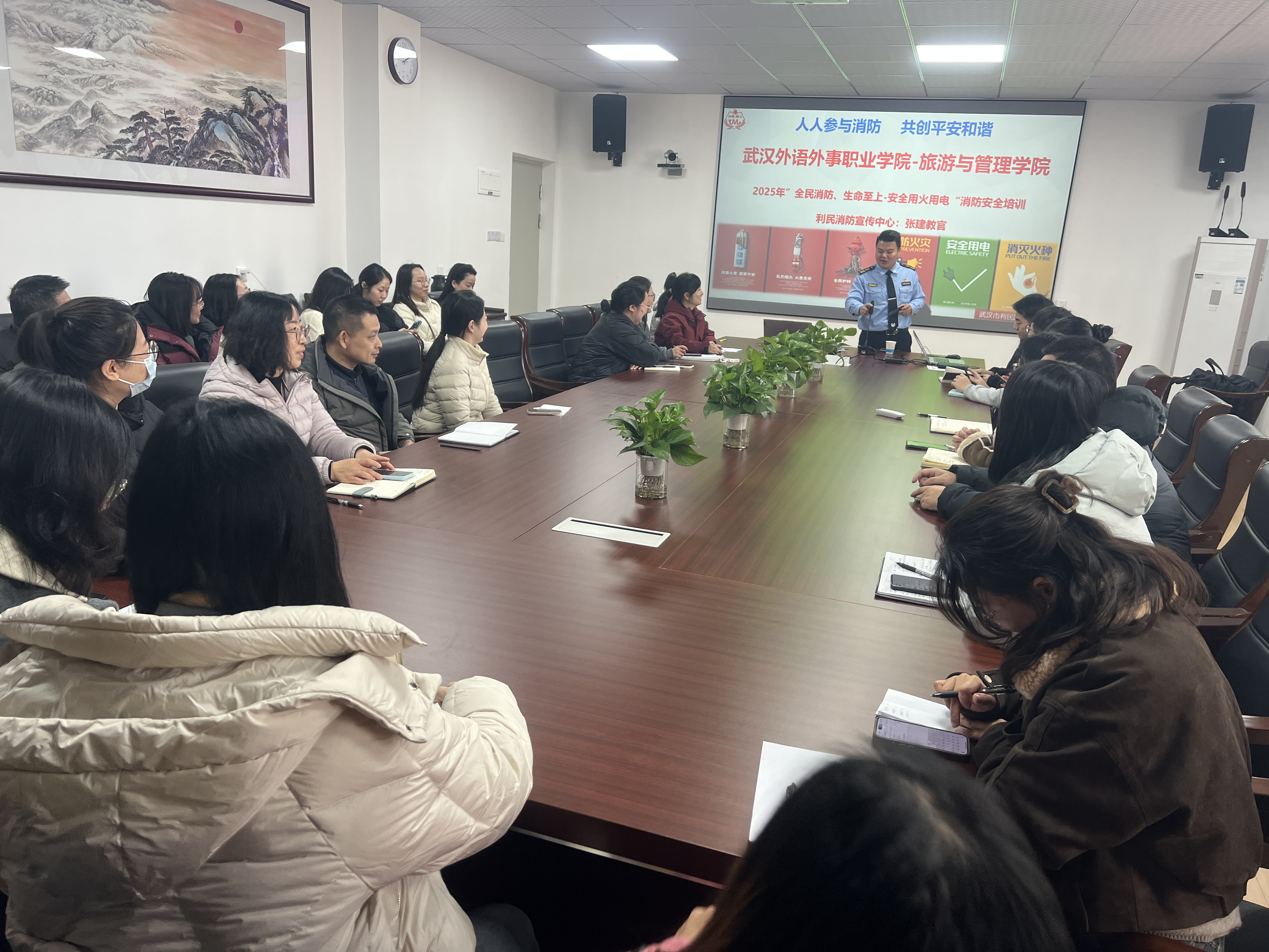 本网讯(通讯员 田纪云)为切实增强教职工的消防安全意识,提升应对突发火灾的自救互救与应急处置能力,筑牢安全防线,2025年12月5日下午14:00,旅游与管理学院特邀请武汉市利民消防技术服务中心来校为全体教职工开展以“全民消防、生命纸上-安全用火用电”为主题的综合性消防安全培训。本次活动摒弃传统说教模式,采用“理论授课+场景演练”相结合的方式,取得了较好成效。