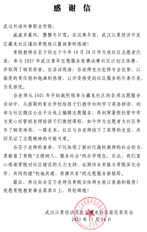 赛后,该教师所服务的社区专门向学校发来表扬信,对谷芸子老师及其团队的志愿服务工作给予了高度评价。