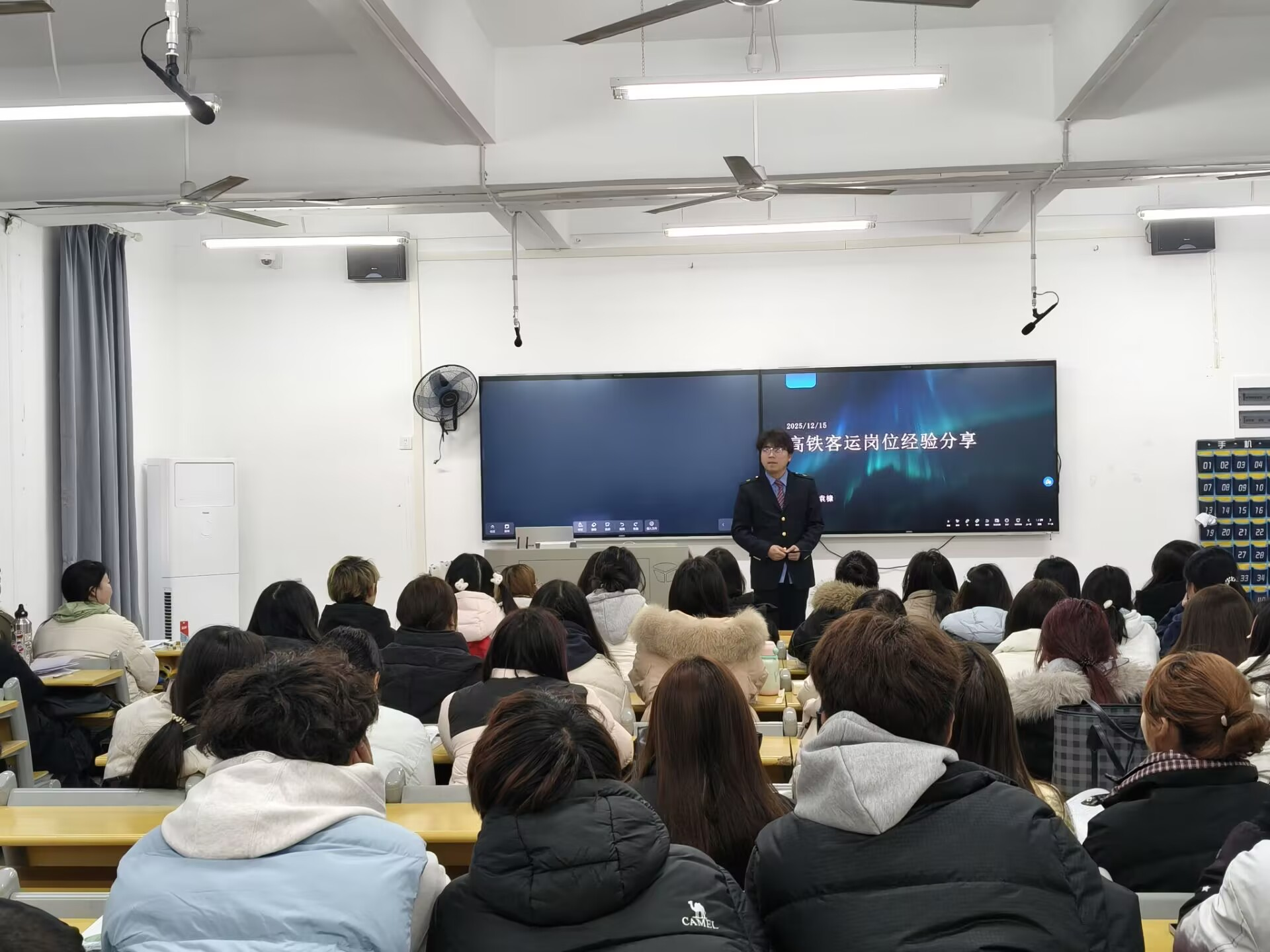 分享会上,袁槺结合自身在高铁客运段的工作实际,生动讲述了从校园到职场的角色转变历程。他围绕“职业选择与定位”、“面试准备与技巧”、“初入职场的心态调整”、“人际沟通与团队协作”以及“在平凡岗位上追求卓越”等同学们关切的话题,进行了深入浅出的剖析。他特别提到,学生干部经历所锻炼的责任感、服务意识和解决问题的能力,为其快速适应铁路客运服务管理工作带来了显著优势。同时,他也强调了持续学习、脚踏实地的重要性,鼓励学弟学妹们无论未来从事何种行业,都要怀揣热情,坚守责任,在实践中不断成长。