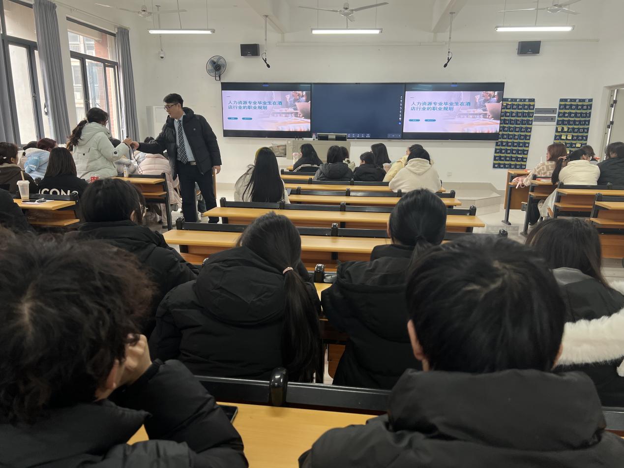 新闻网讯(通讯员 莫小惠)为深化产教融合,搭建校企协同育人桥梁,帮助人力资源管理专业学子明晰职业发展方向,2025年12月17日,我院特邀玛雅酒店人力资源部门高经理走进2025级人力资源管理专业课堂,开展以“人力资源专业在酒店行业的职业规划”为主题的专题讲座。