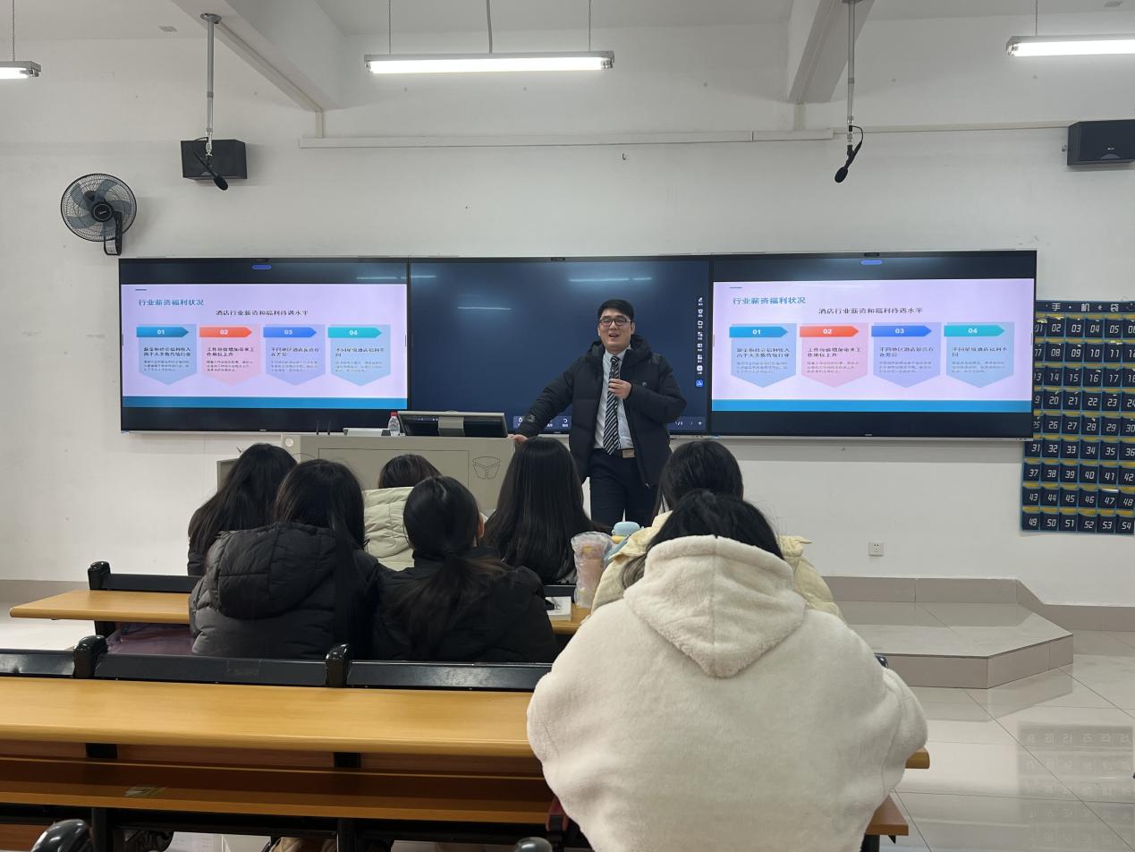 随后,高经理结合酒店行业发展趋势,为同学们拆解了人力资源专业的职业晋升路径。他强调,初入职场的人力专员要夯实基础,从员工入职办理、考勤核算等基础工作中积累经验;进阶阶段可向招聘、培训、绩效等模块深耕,成长为模块主管;资深从业者则可向人力资源经理、总监方向迈进,甚至跨界参与酒店运营管理。同时,他还贴心分享了酒店人力岗位的招聘要求,提醒同学们在校期间要注重提升沟通协调、应急处理能力,考取人力资源管理师等职业资格证书,为未来求职增加砝码。