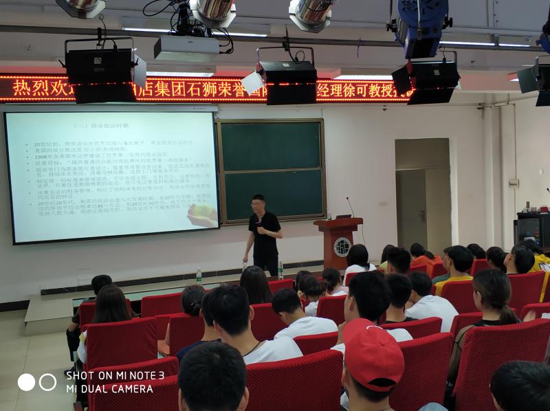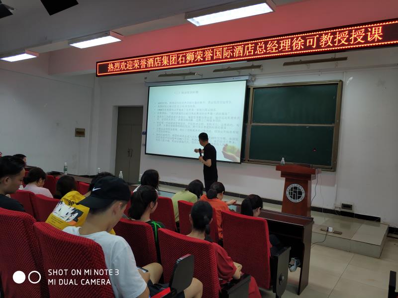 2019年6月10日14:10--15:10,南一报告厅,荣誉国际酒店总经理、我院客座讲授徐可先生百忙中给2018级学生授课。