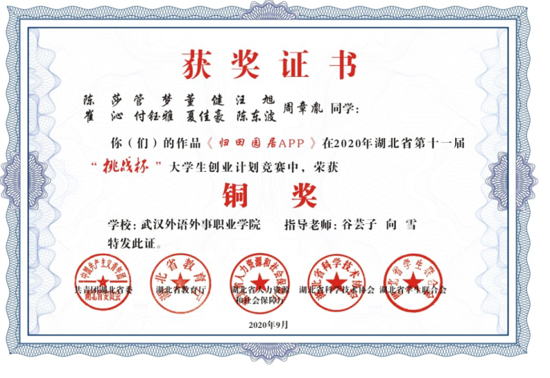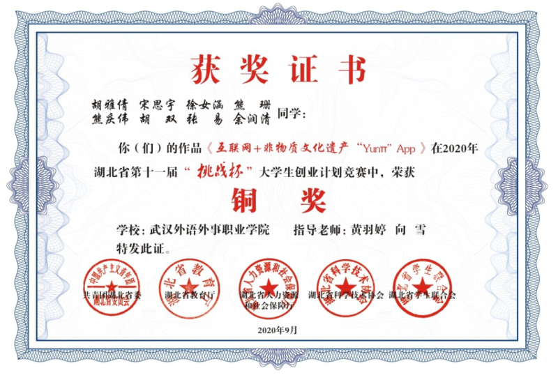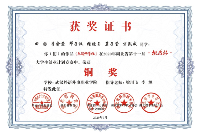2020年注定是不平凡的一年,虽然经历了严重的疫情,但是没有阻挡学部师生向科技竞赛进军的步伐。在今年的湖北省第十一届“挑战杯”大学生创业计划竞赛中获奖中,旅管学部三幅作品荣获铜奖,点燃了校外科技竞赛的热情。(王波供稿)