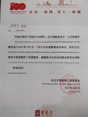 2021年7月,旅管学部谷芸子老师在黄鹤楼圆满完成了红色研学的社会服务。
