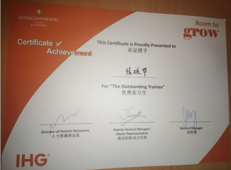 张婉华同学无疑是越努力越优秀的代表,获得武汉洲际酒店优秀实习生的确是实至名归!(供稿人 谷芸子)