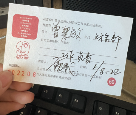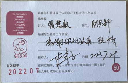 (谷芸子供稿)20级酒管1班的曾慧敏在武汉玛雅嘉途酒店咖啡厅担任收银员一职。即使是在暑假最繁忙的时段,面对巨大的工作压力,她仍然连续两次荣获酒店给予员工最高级别“服务品质提升点赞卡”。只有同时具备“motivation(激励自我)、aspiring(追求卓越)、youthful(朝气蓬勃)、appreciate(心怀感恩)”特质的员工才能获得。