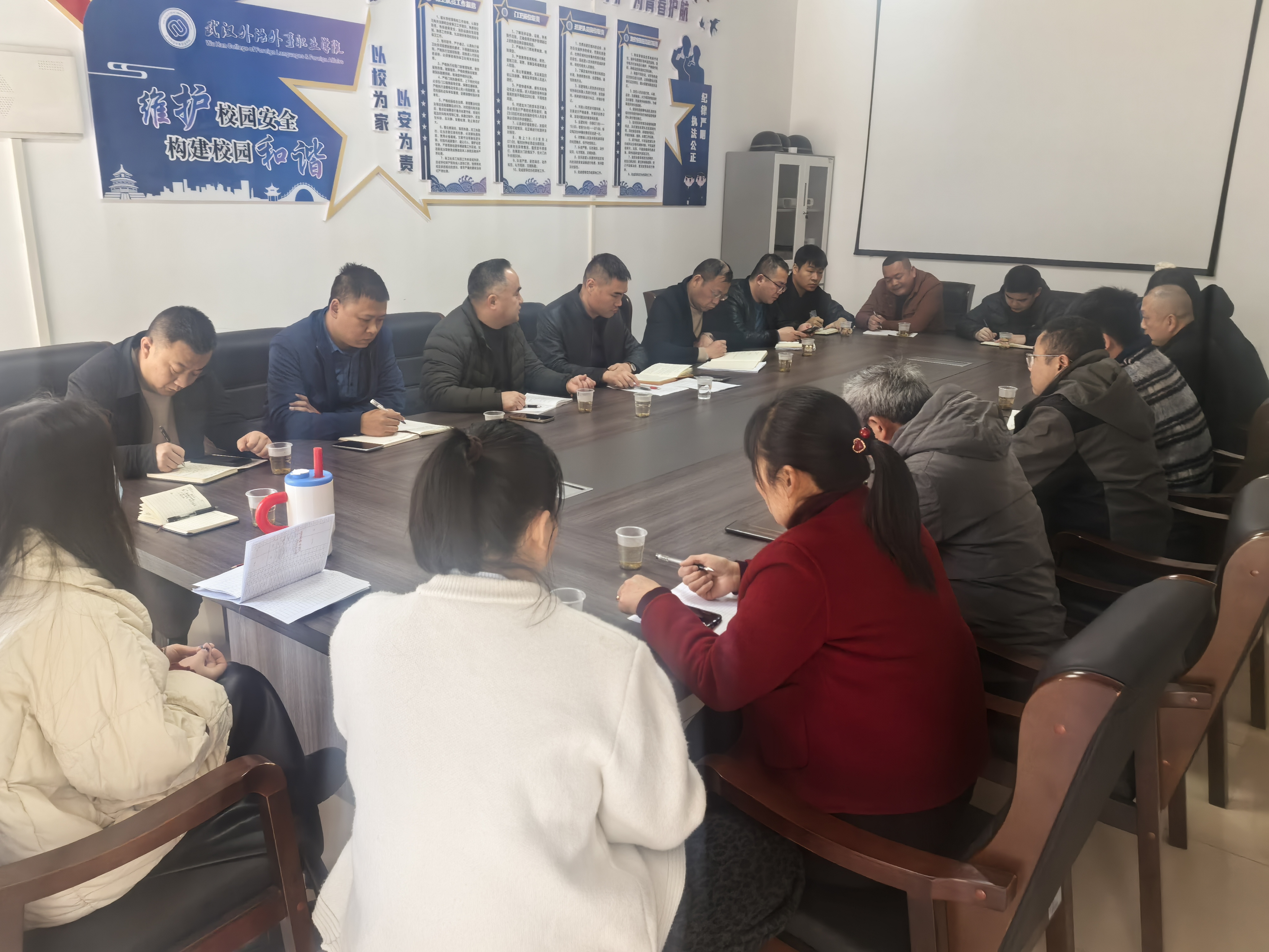 新闻网讯(通讯员 尤玄)近日,武汉外语外事职业学院、武汉光谷职业学院后勤保卫处全体管理人员联合召开工作例会。副校长陶智勇出席会议并讲话,会议以两校融合一体化攻坚提质年为核心主题,统一思想、明确任务、压实责任,全面推动两校后勤保卫工作深度融合、协同提质。