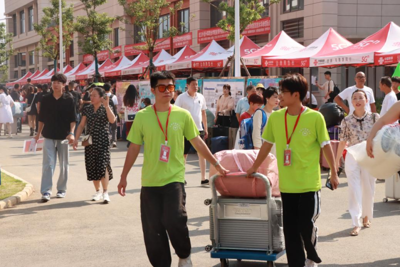 早晨7点,志愿者们便开始了一天的迎新工作。他们分布在校园的各个角落,为新生们指引路线、搬运行李、办理报到手续,提供最贴心的服务。志愿者们不仅热情接待前来咨询的新生和家长,还有流动的志愿者们在校园内不间断巡视,以便随时为需要帮助的新生提供帮助。