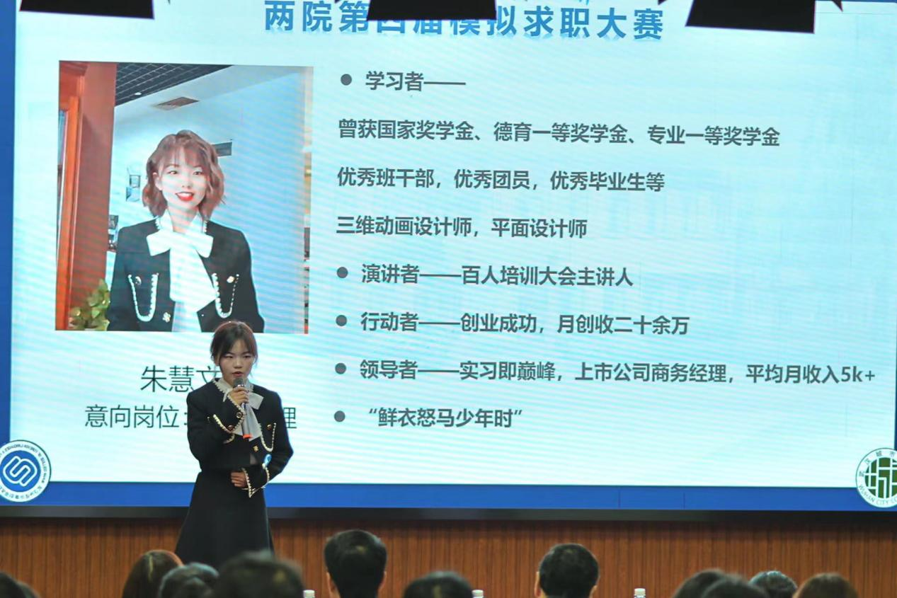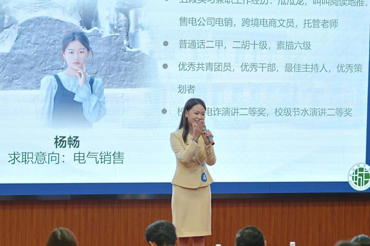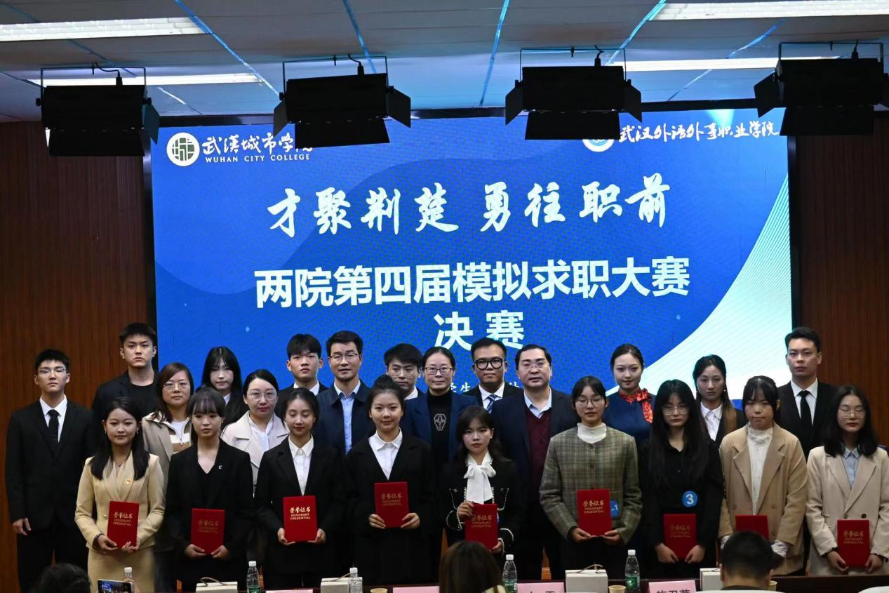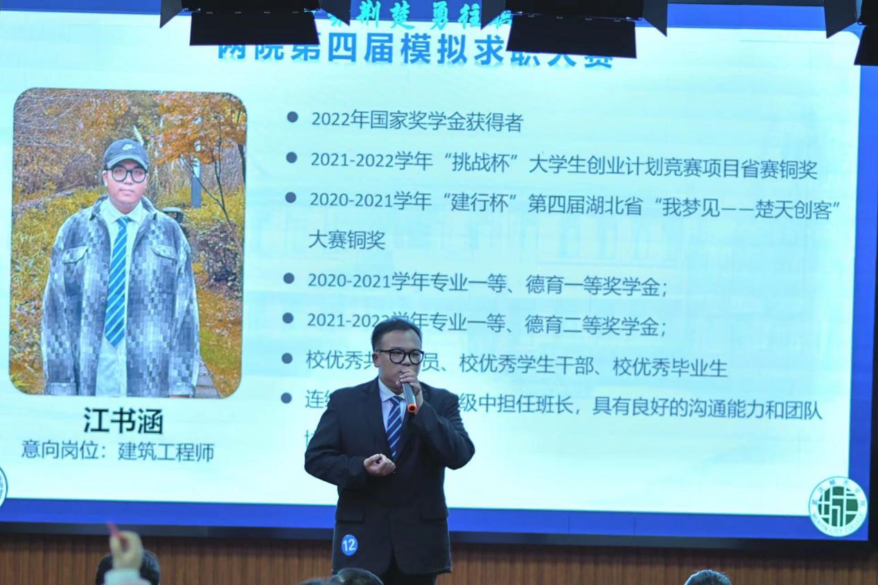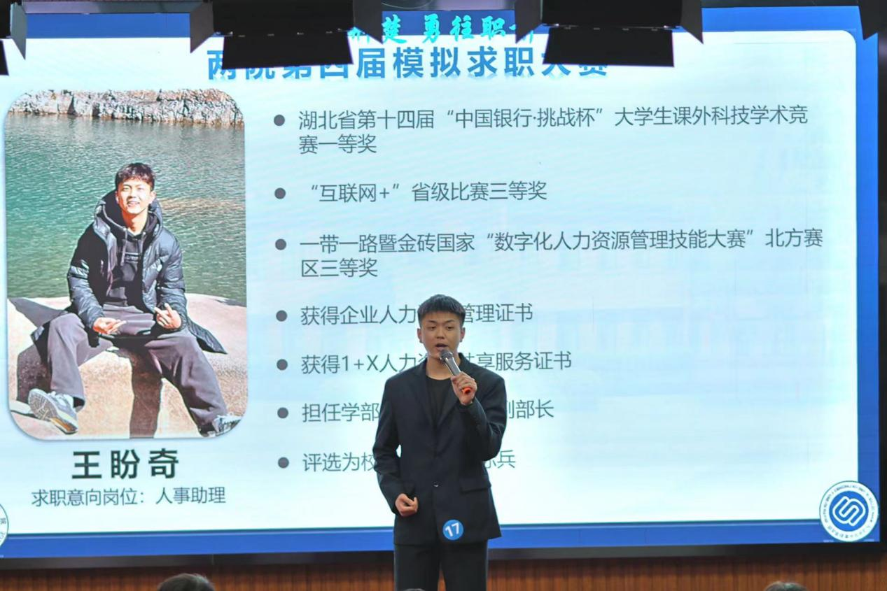 智联招聘武汉分公司市场总监、智联招聘高级讲师白雪,国家高级人力资源师、国际职业策划师王超,华通人才、易聘会展湖北有限公司总经理王斌贤,智联招聘易叶,我院学工处副处长施卫荣担任评委。