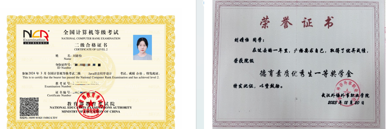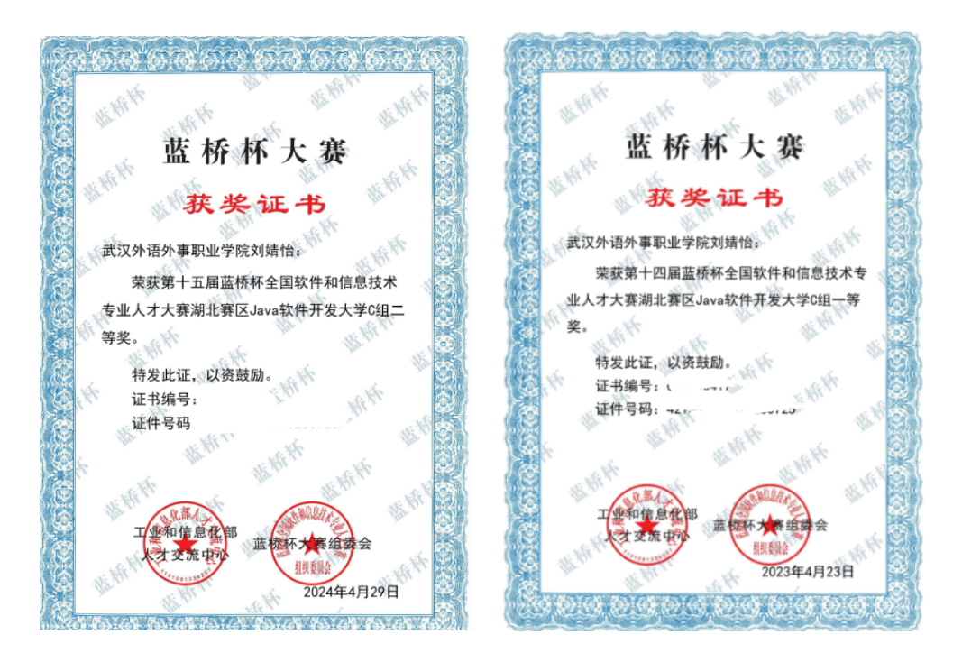 在课外竞赛当中,刘婧怡同学积极参与专业竞赛,提升实践能力。在2023-2024学年,荣获第十四届蓝桥杯全国软件和信息技术专业人才大赛湖北赛区java软件开发大学c组一等奖;在2024-2025学年,荣获第十四届蓝桥杯全国软件和信息技术专业人才大赛湖北赛区java软件开发大学c组二等奖。