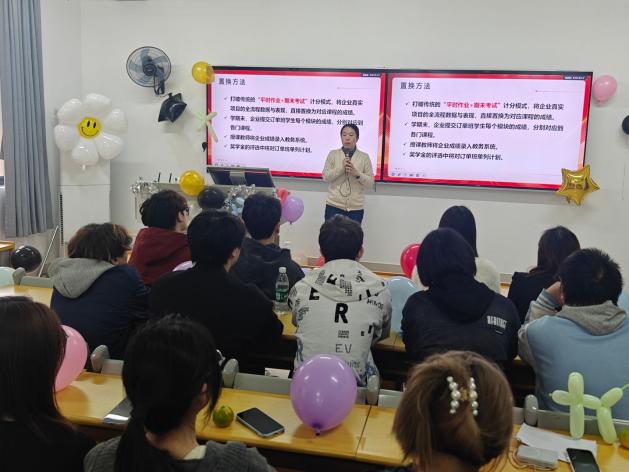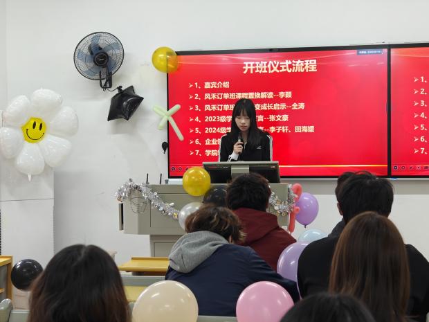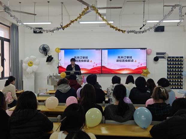 随后,仪式进入核心环节。信息技术学院副院长李颖老师率先上台,围绕 “风禾订单班课程置换解读” 展开分享。她详细介绍了订单班课程体系与学院现有课程的衔接逻辑,从课程内容优化、课程学分认定、企业师资融入等方面,清晰阐述了课程置换的具体方案。李颖院长强调,课程置换旨在打破传统教学与企业需求的壁垒,让学生在在校期间就能接触行业前沿知识与技术,为未来进入企业工作奠定坚实基础,其专业且细致的解读让在场学生对订单班的学习规划有了更明确的认知。