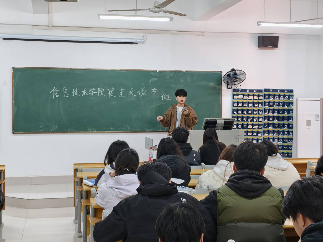 (信息技术学院 通讯员 程思颖 张鑫伟)为丰富校园生活,营造更好的校园宿舍环境氛围,展现新一代大学生青春风采和创新力,开展了“第三届校园寝室文化节”活动,于11月20日在三号教学楼向参赛选手告知相关事宜。