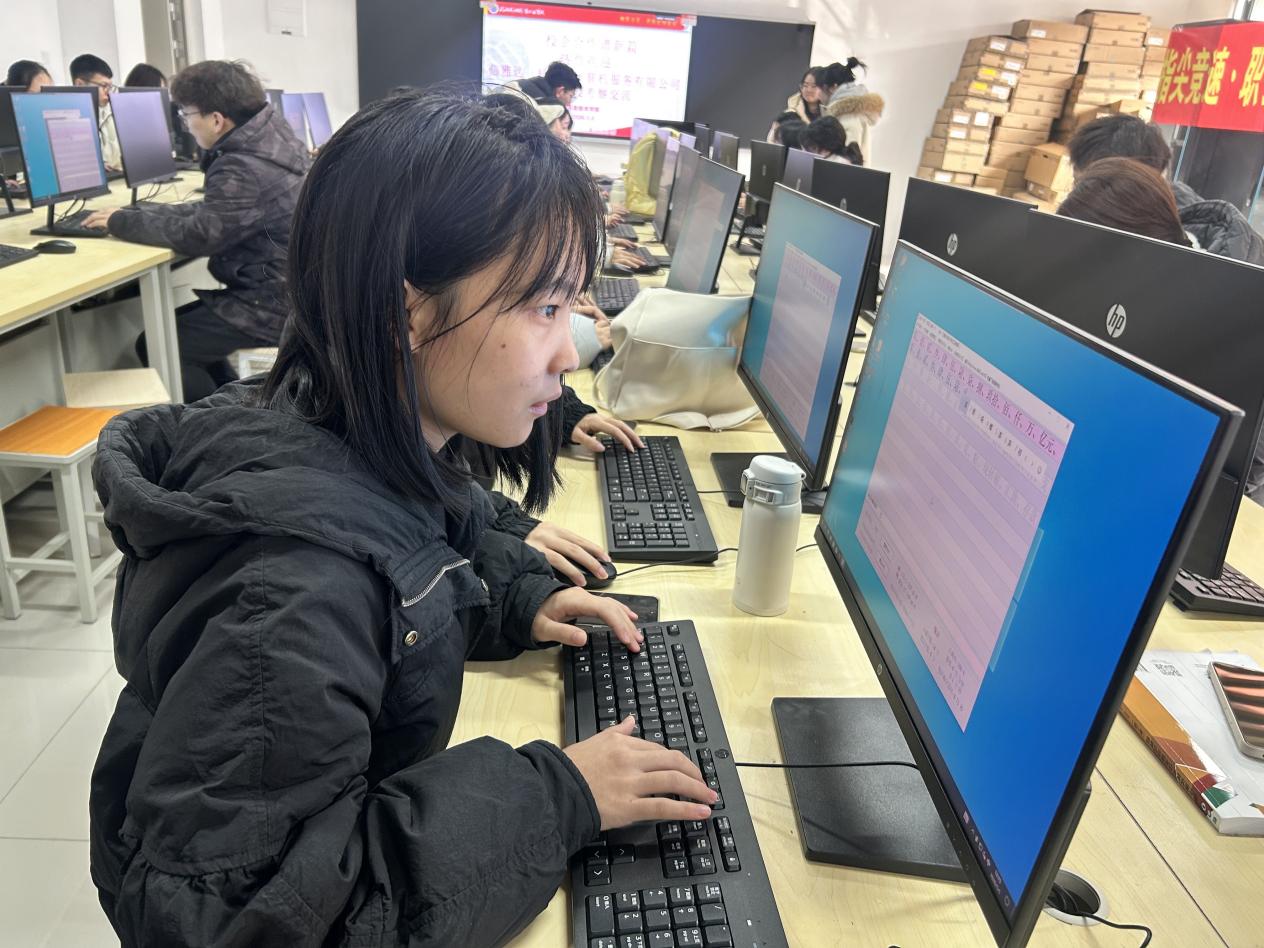 为强化学生实践技能,宣讲会同步举办了“指尖竞速 职引未来——信息技术学院银行信息录入专项打字技能集训暨选拔赛”。选拔赛围绕企业实际业务场景设计,要求学生达到汉字录入120字/分钟、数字录入200字/分钟的基础标准,与信雅达BPO岗位(如银行文员、数据审核等)的用人需求紧密衔接。参赛学生全神贯注,指尖飞舞,展现了信息技术学院学子扎实的专业基本功,为后续实习应聘积攒了竞争优势。
