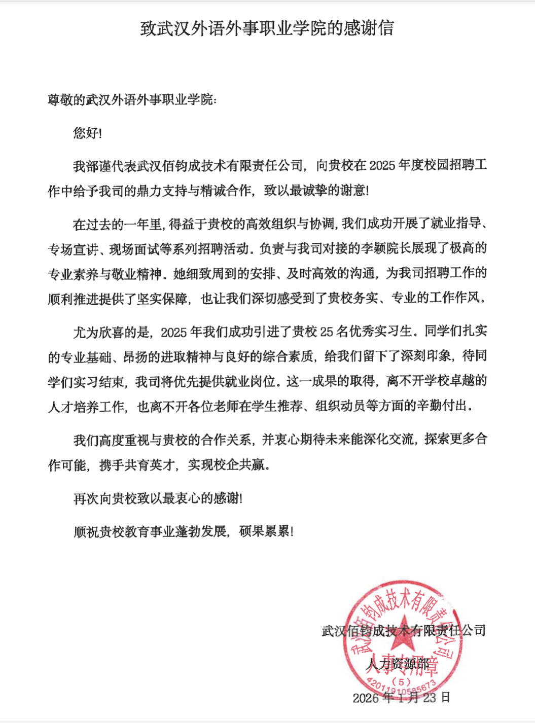 (商业航天与低空技术学院 通讯员 杨维)2026年1月23日,武汉外语外事职业学院商业航天与低空技术学院收到来自武汉佰钧成技术有限责任公司的感谢信,信中对我院在2025年度校园招聘、实习就业合作中的鼎力支持与精诚合作表达了诚挚谢意,高度肯定了我院人才培养质量及李颖副院长的专业工作。