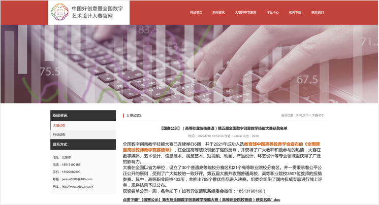 全国数字创意教学技能大赛于2021年成功入选教育部中国高等教育学会发布的《全国普通高校教师教学竞赛榜单》,在全国高等院校引起了强烈反响,并获得了广大教师积极参与的热情,大赛在数字媒体、艺术设计、信息技术、视觉艺术、短视频、动画、产品设计、环艺设计等专业领域里获得了广泛的影响力。