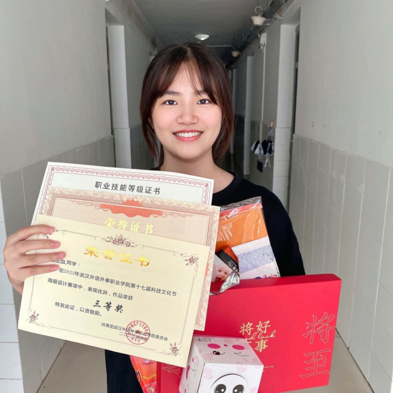 20级数媒三班的张梓桐同学获得了两个奖,激动之情溢于言表:“我很荣幸这次能获得两个奖项!刚转到数媒时,我惴惴不安又毫无方向,而现在的我,无疑是向前迈进了一大步。我认为做任何事,无论从什么时候开始都不算晚,学习是永无止境的。1+x证书的荣誉,是对我过去两年学习的肯定,也是对未来工作的鞭策,非常感谢老师们对我的栽培,在校学习期间,我过的很充实。我想,任何人,任何付出,都会开花结果,我们需要的是一份坚持和努力。”