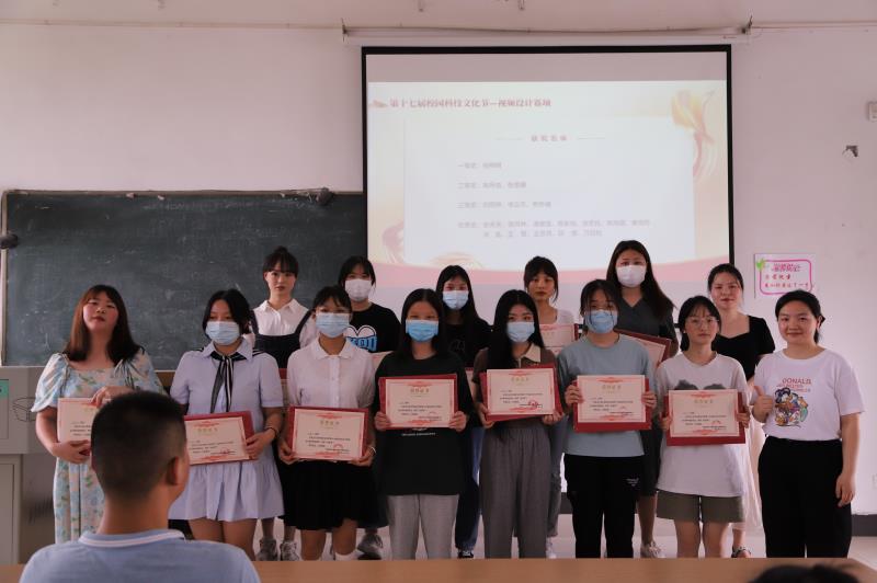 获得科技文化节获奖学生与教师刘畅(前排右一)、辅导员王娜(后排右一)合影
