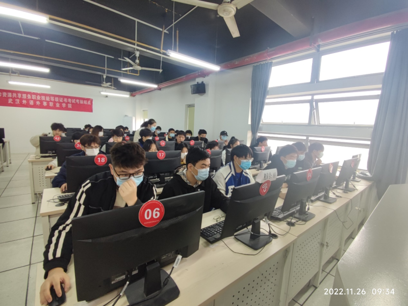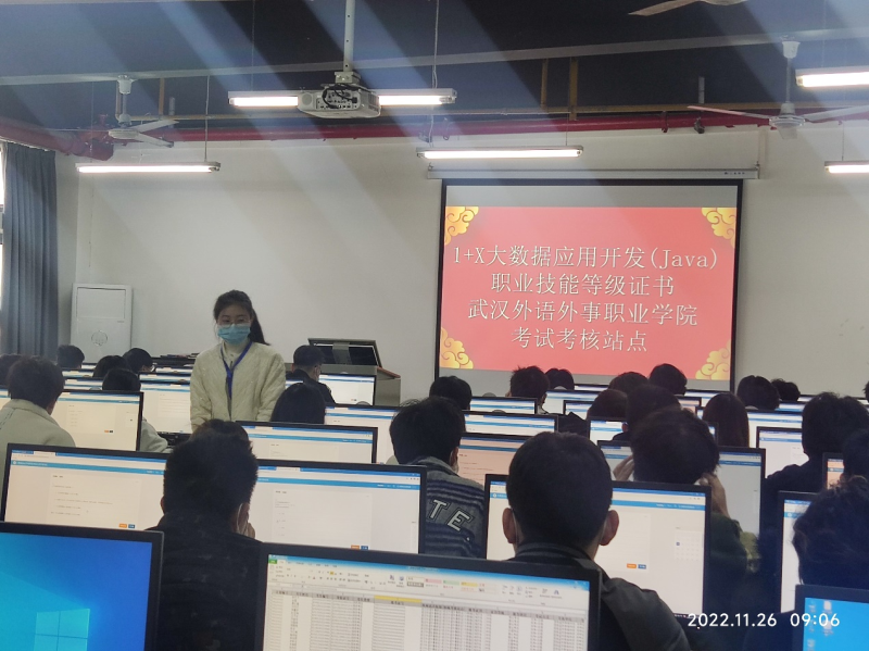 (信息技术学院 讯)为落实《国家职业教育改革实施方案》精神,持续推进1+X证书制度试点工作,软件专业制订了详尽的教学计划,认真组织学生培训。11月26日,2022年教育部“1+X”大数据应用开发(Java)职业技能等级证书中级认证考试(武汉外语外事职业学院大数据应用开发技能等级证书考核站点)顺利开考。考试分为理论和实操题两大部分内容,我校21级软件技术专业72名学生参加了此次考试,并以100%通过率再一次圆满完成了考证工作。