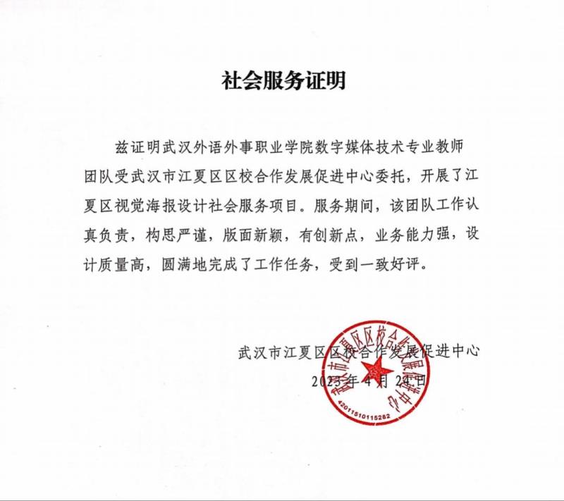 (信息技术学院 讯)近日,信息技术学院数字媒体技术专业青年教师孔子孟,带领三位优秀学生代表21级数媒4班王壮、21级数媒4班黄怡婷、22级数媒5班孔靖月同学,受武汉市江夏区区校合作发展促进中心委托,开展了江夏区视觉海报设计社会服务项目。服务期间,他们工作认真负责,构思严谨,版面新颖,有创新点,业务能力强,设计质量高,圆满地完成了工作任务,受到一致好评。恭喜孔子孟老师团队!