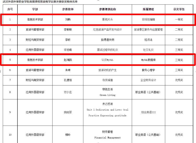 (信息技术学院 讯)2023年5月25日上午,学院2023年首届课程思政教学比赛决赛在图书馆204智慧教室圆满落幕。经过激烈角逐,信息技术学院青年教师刘畅荣获一等奖;计算机应用技术系副主任赵海鸥荣获三等奖。