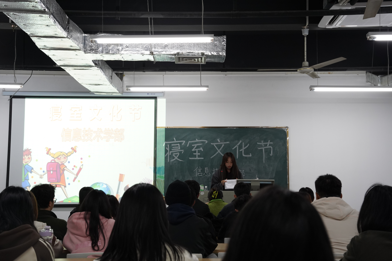 (信息技术学部 讯)为推进寝室文明建设,营造温馨氛围,引领健康,整洁,舒适,和谐的寝室文化,丰富大学生宿舍文化生活,新增大学生自主创新意识,展现当代大学生良好精神风貌,信息技术学部于11月23号晚上七点在综合楼j416举办“寝室文化节”。