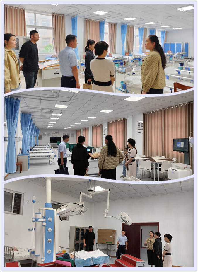 会谈后,两院领导共同参观考察了该院实验实训中心。该校实验中心主任详细介绍了学校的护理教育特色、实训室建设情况,分享了在教学管理、人才培养等方面的宝贵经验。我学部团队深入各实训室,详细了解设备配置、课程设置、实践操作等方面的具体情况,并与在场的师生进行了深入的交流。在参观模拟病房时,其高度仿真的环境和先进的设备给我部老师留下了深刻印象。焦院长表示,这种高度还原的工作环境有助于学生在校期间就熟悉真实的工作场景,提高临床实践能力;同时也体现了“以学生为中心,以实践为重点”的教学理念,既突出学生的主体地位,又强调了实践教学的重要性。
