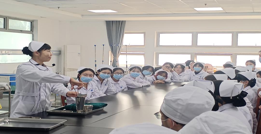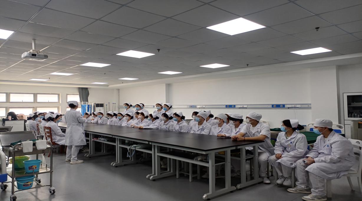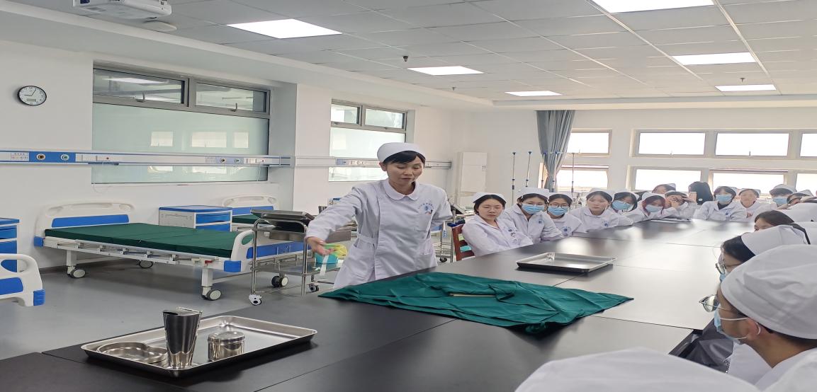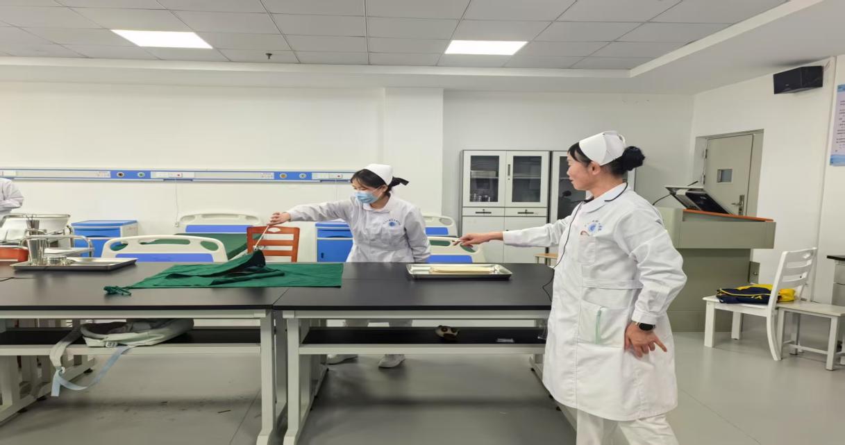 清晨的阳光透过护理实训室的玻璃窗,洒在一尘不染的操作台上。医疗与护理学院综合楼三楼的实训教室内,四十余名身着白色护士服的学生屏息凝神,目光聚焦在操作台前的身影——龚斌老师正以行云流水般的动作演示护理操作中的核心技能“无菌巾半铺半盖法(双手法)”。这堂课既是专业技能的淬炼,更是职业精神的传承。