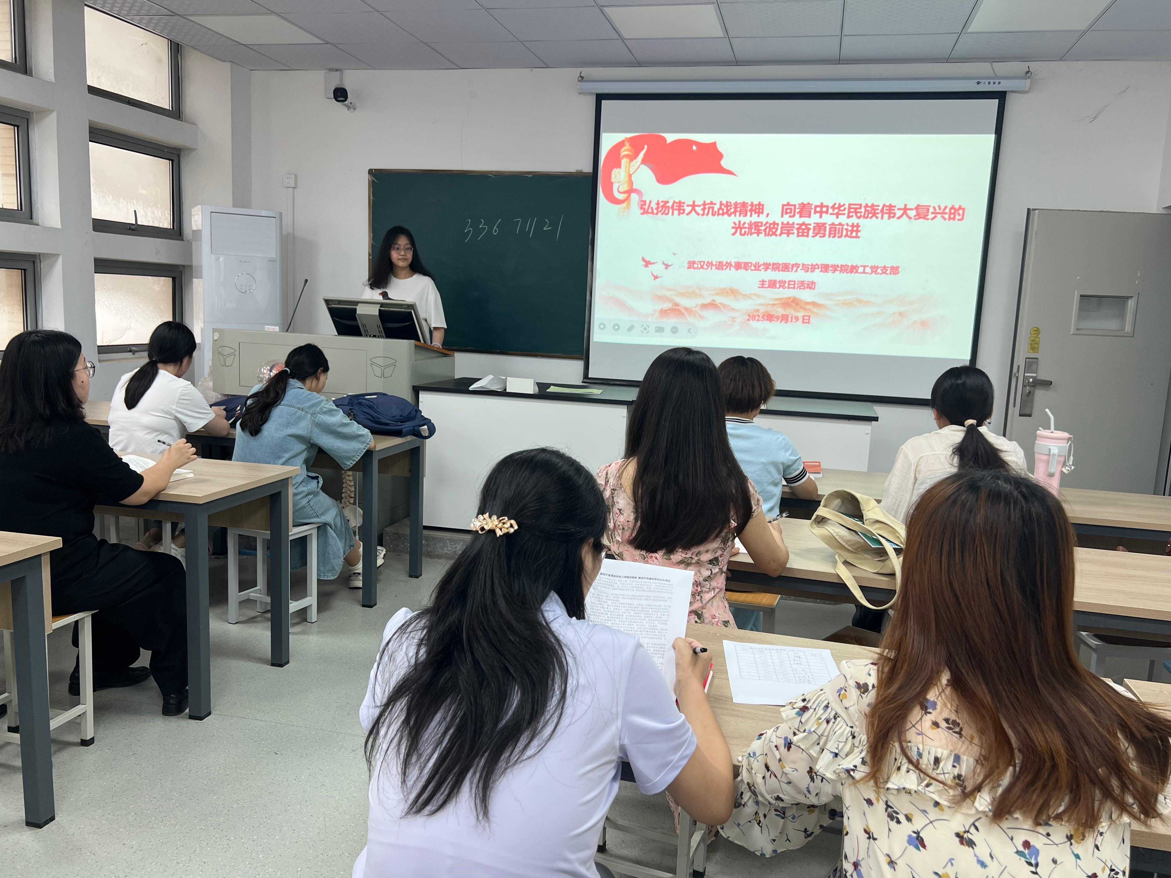 2025 年9月19日,武汉外语外事职业学院医疗与护理学院教工党支部以 “弘扬伟大抗战精神,向着中华民族伟大复兴的光辉彼岸奋勇前进” 为主题,召开专题党日活动。全体教工党员齐聚一堂,在重温红色记忆中筑牢信仰之基,在严明作风纪律中砥砺奋进之志。