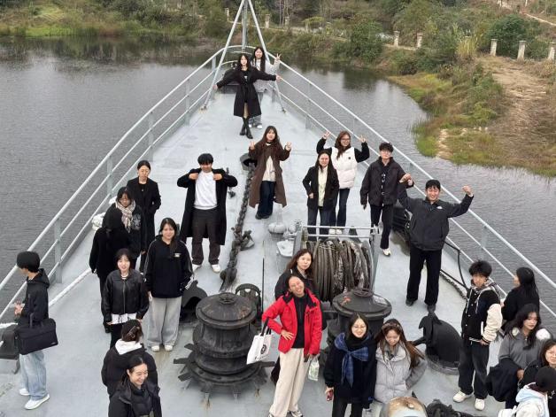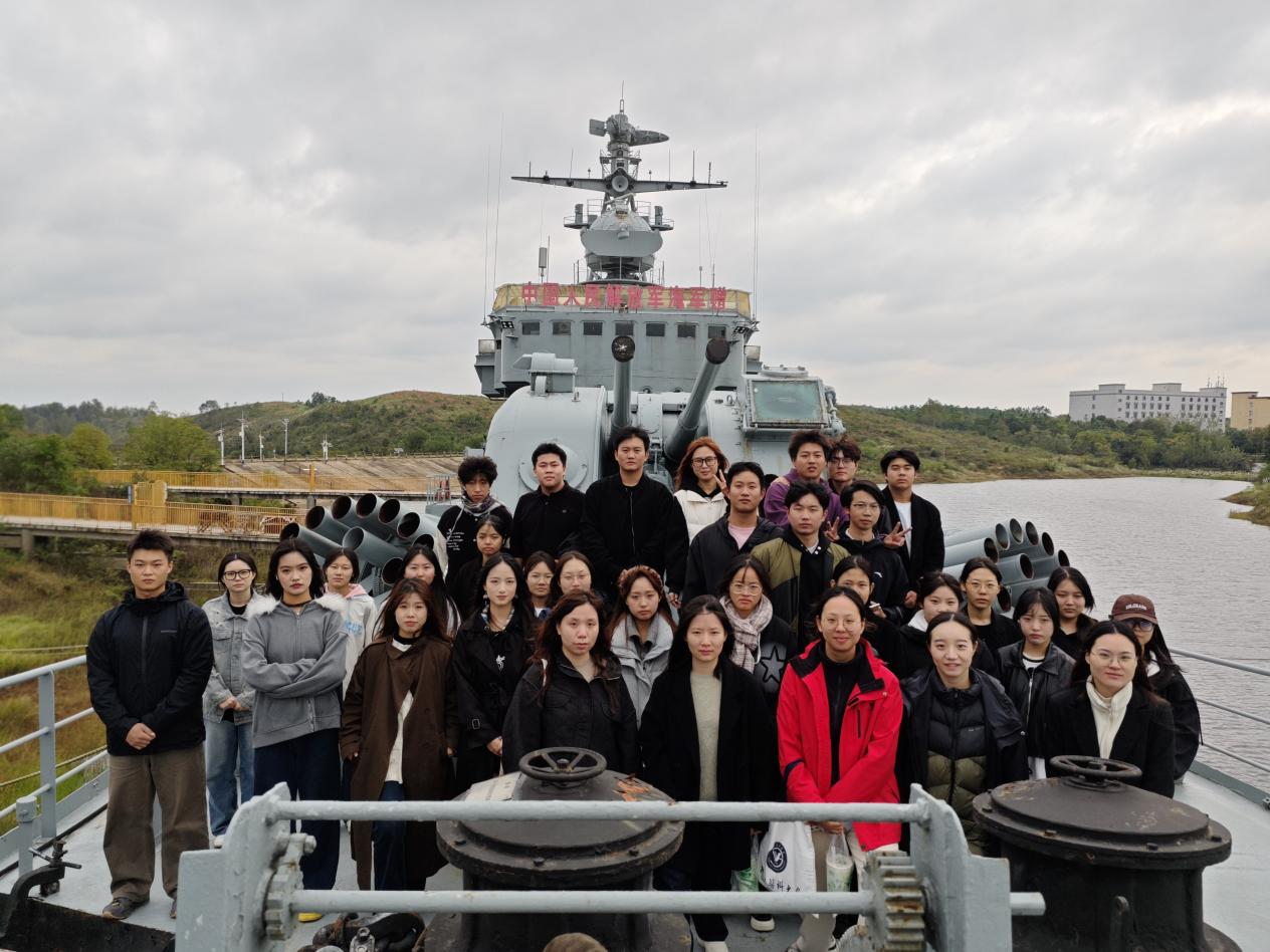 午后,大家不畏艰难,穿过泥泞小路,跨越简易木桥,登上了“106军舰”,即西安舰。这艘曾守卫祖国海疆的功勋战舰,如今成为国防教育的重要载体。甲板上,同学们触摸舰炮、探访舱室,感受人民海军从无到有、由弱到强的奋斗历程;展厅内,现代化海军装备模型与历史影像交织,展现了强国强军的时代画卷。许多同学感慨:“从前只在课本上读到‘蓝色国土’,今天站在军舰上,才真切体会到守护万里海疆的意义!”