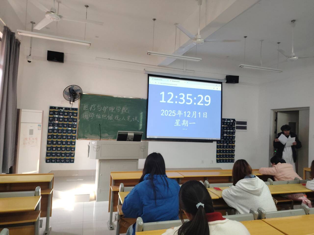 为进一步加强学院共青团与学生组织建设,优化学生干部队伍结构,选拔政治坚定、能力突出、作风优良的学生骨干,推动团学工作持续健康发展,医疗与护理学院于2025年12月1日在三教组织召开团学换届组织工作会议,并同步开展新一届团学干部竞选的面试与笔试环节。学院团委书记赵娜老师、辅导员代表及全体竞选候选人共同参与了本次活动。