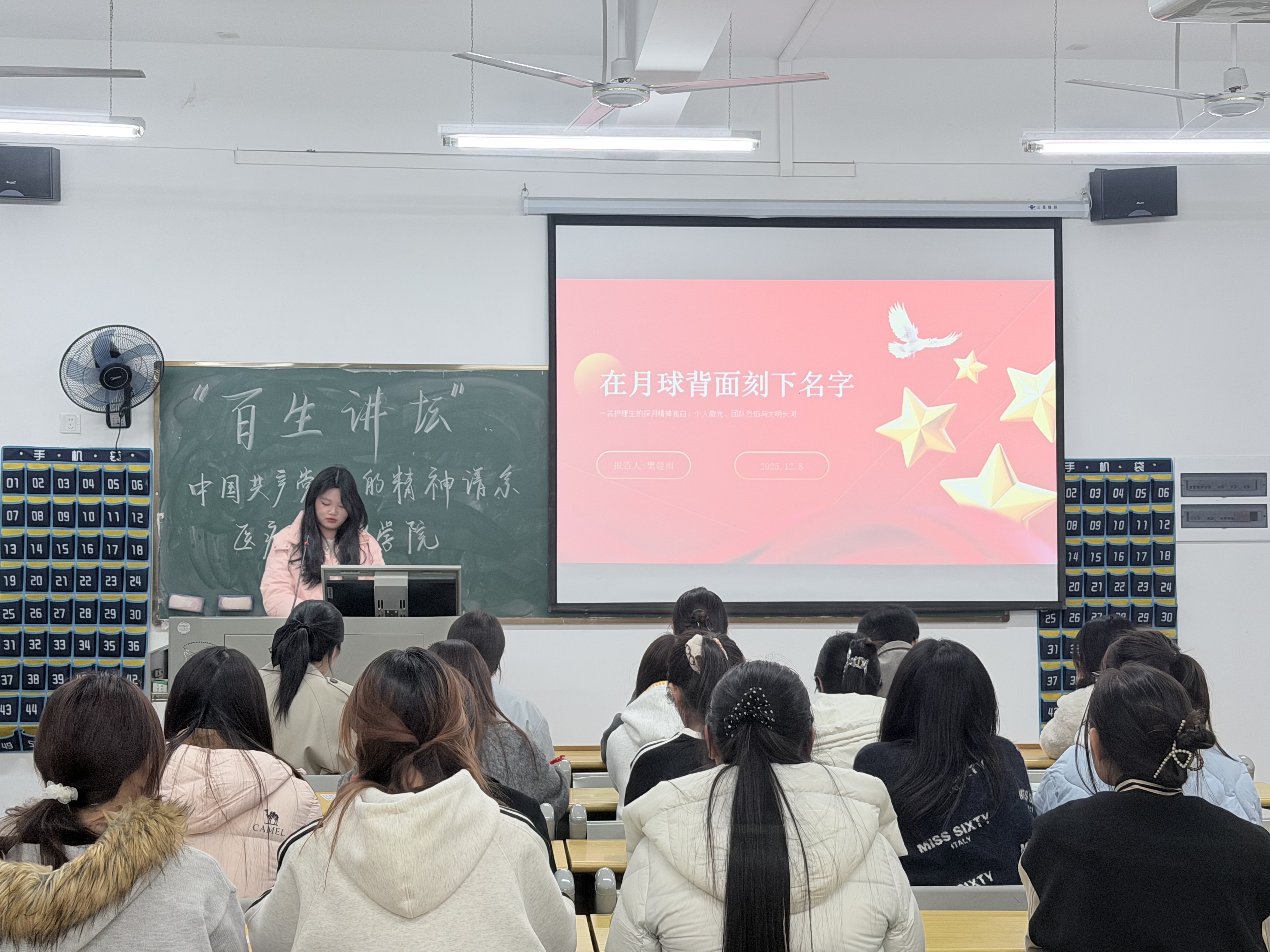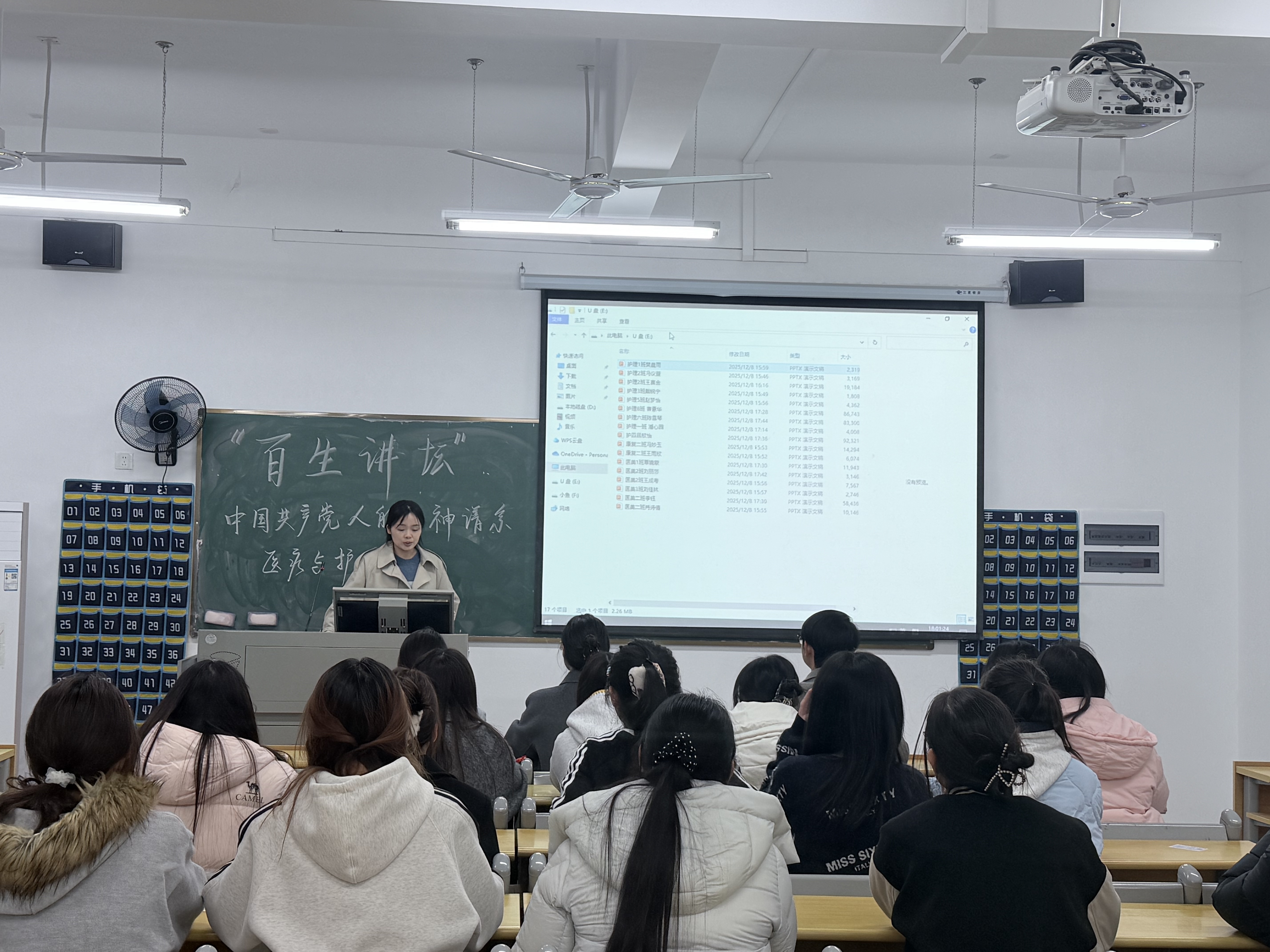 为进一步丰富学院校园文化生活,搭建跨领域思想交流平台,引导青年学生拓宽认知视野、涵养人文素养,医疗与护理学院于 2025 年 12 月 8日在三教顺利举办 “百声讲坛” 主题活动。本次讲坛以 “讲好红色故事,传递青年声音” 为核心,学院分团委书记赵娜老师、辅导员代表及24级、25级各班级团支部代表共同参与了本次活动。