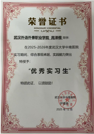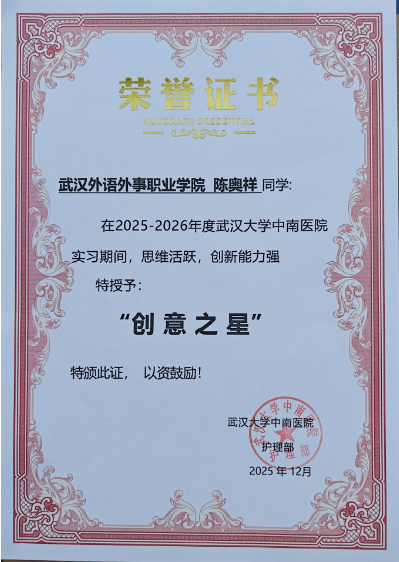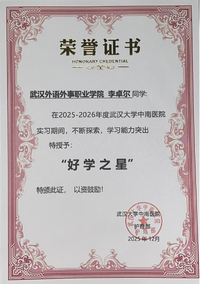 为全面激励成长,表彰多元才华,经武汉大学中南医院严格评审,医疗与护理学院23级护理专业晁泽楷、熊欣阳两位同学荣获“优秀实习生”称号,他们以全面优异的表现为标杆;李卓尔同学获评“好学之星”,展现了笃学不倦的探索精神;陈奥祥同学荣膺“创意之星”,彰显了勇于创新的思维活力。
