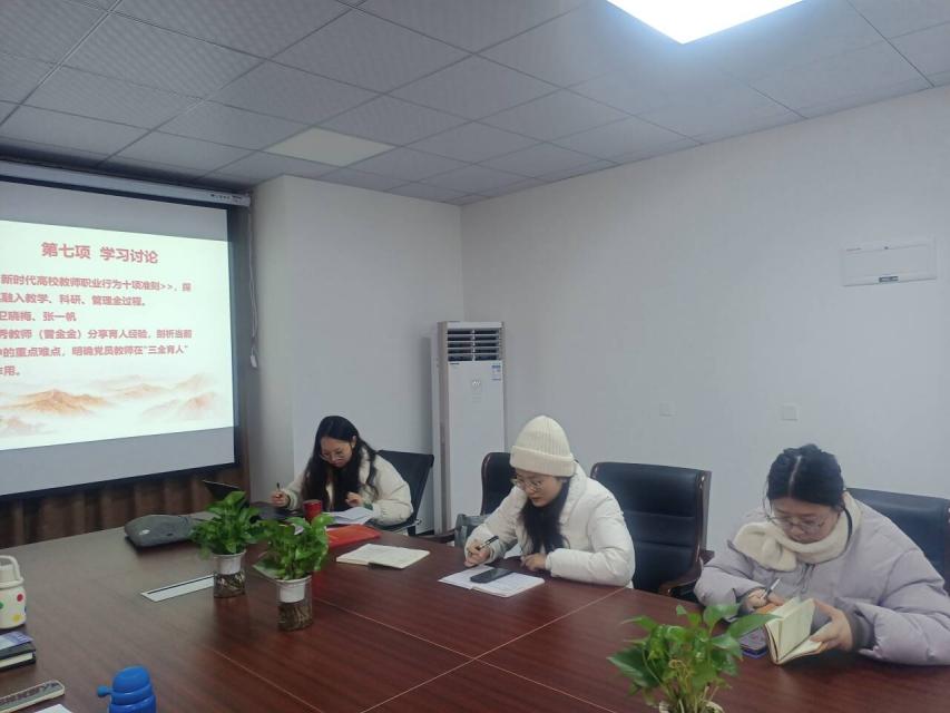 结合学习内容,支部组织全体党员认真研读《新时代高校教师职业行为十项准则》,围绕“如何将准则要求融入教学、科研、管理全过程”开展专题讨论。党员教师张一帆表示:“准则为教师职业行为划定了清晰底线,我们要以德立身、以德立学,在教育教学中严守纪律、规范言行,争做学生为学、为事、为人的示范者。”