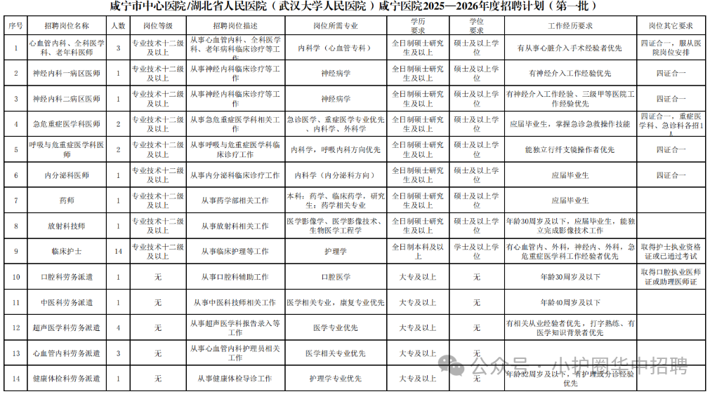 我院2025—2026年度第一批招聘计划共14个岗位(含劳务派遣岗位5个),需求人数共36人(含劳务派遣需求人数10人),详细岗位条件及要求见咸宁市中心医院/湖北省人民医院(武汉大学人民医院)咸宁医院2025—2026年度招聘计划。