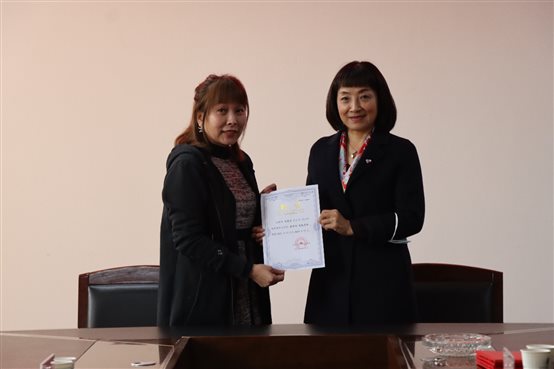 赵光红与刘美芳签署合作协议,并为刘美芳颁发武汉城市学院医学部特聘教授聘书。