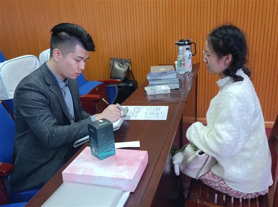 讲座结束后,刘美芳与彭玮对有意向的学生进行现场面试。