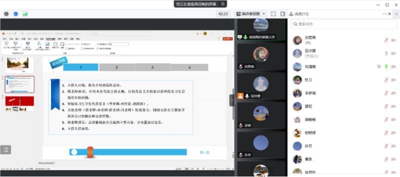 2023年1月17日下午14:30—15:30,医学部周清梅老师主持的“以渔工作室”于线上开展了实习生管理方案交流会。本次会议共同商榷外院实习生最优管理模式,探讨外院校外实习生的最佳管理办法,形成经验总结。